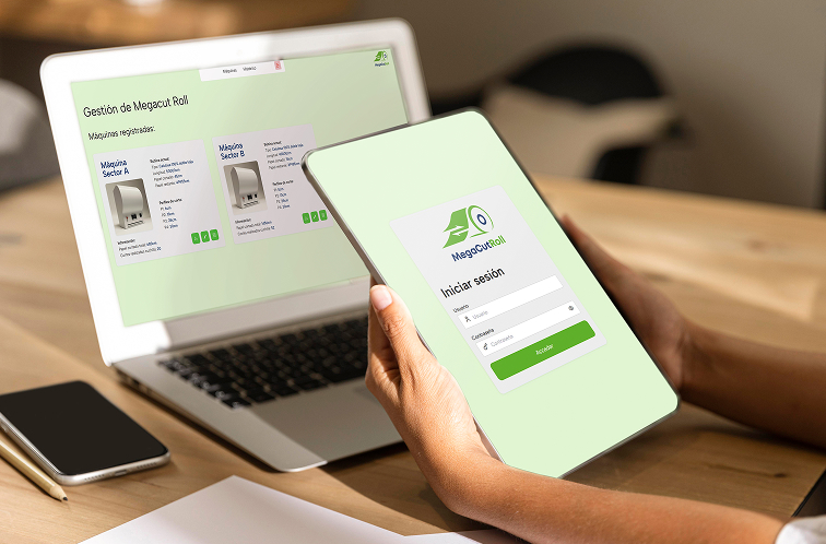 MegaCutRoll cuenta con un sistema de conectividad avanzada mediante una aplicación intuitiva que permite gestionar todos los aspectos del dispositivo desde cualquier lugar. A través de la app, es posible supervisar en tiempo real el consumo de bobinas, controlar el stock disponible, planificar cortes personalizados y recibir alertas de mantenimiento o necesidad de reposición.